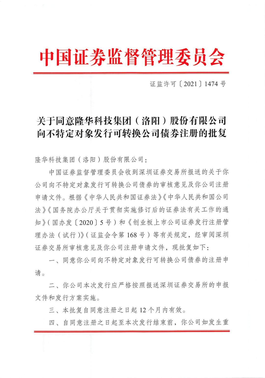 近日,隆華科技收到中國證券監(jiān)督管理委員會出具的《關于同意隆華科技集團(洛陽)股份有限公司向不特定對象發(fā)行可轉(zhuǎn)換公司債券注冊的批復》(證監(jiān)許可〔2021〕1474號)。
