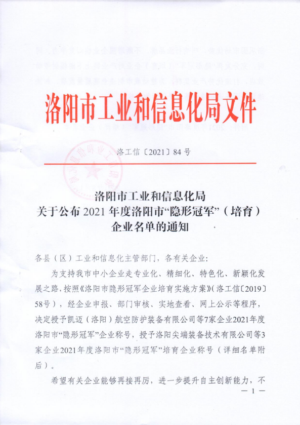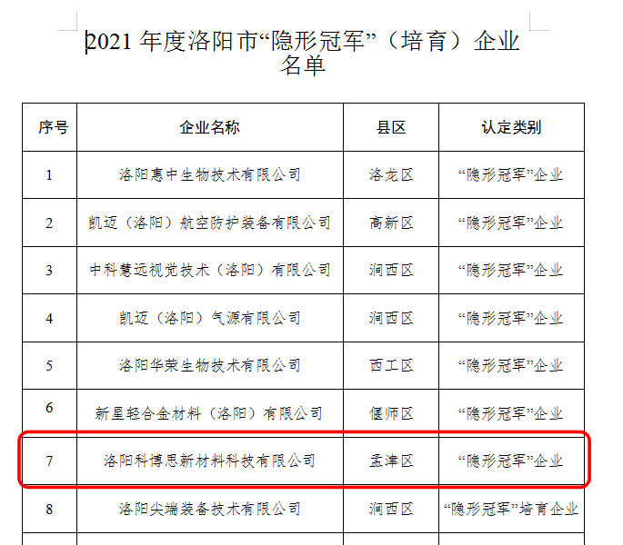 近日,洛陽市工業(yè)和信息化局印發(fā)了《關(guān)于公布2021年度洛陽市“隱形冠軍”(培育)企業(yè)名單的通知》(【2021】84號),洛陽科博思新材料科技有限公司榮獲“隱形冠軍”企業(yè)稱號。